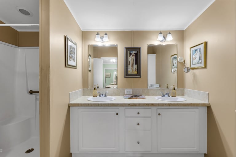 The spacious primary suite offers an en suite bath and large mirrored closet, while the second bedroom sits near a full guest bathroom