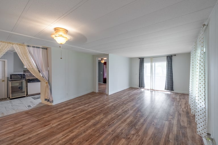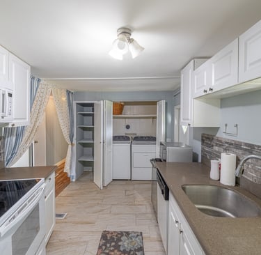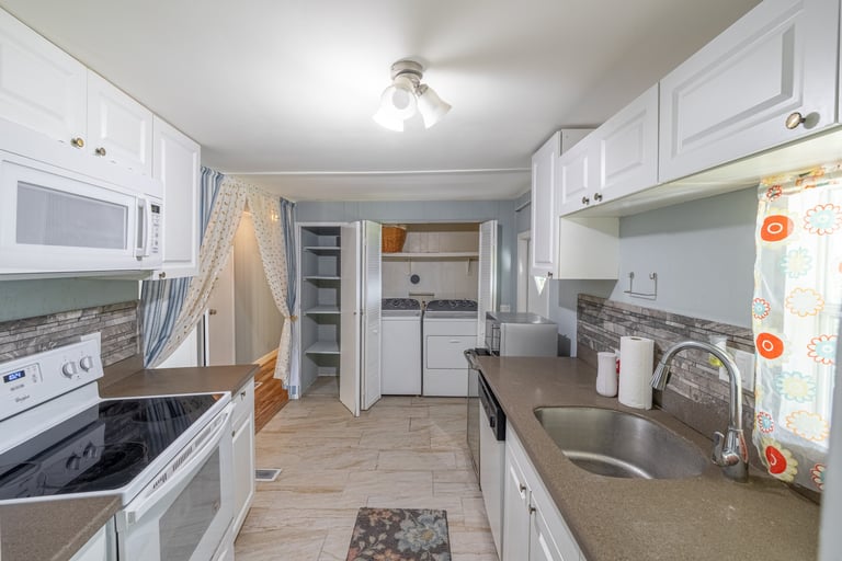 The home features a bright, open layout with laminate and tile flooring throughout. The kitchen is fully equipped with a refrigerator, stove/oven, dishwasher, and microwave. A washer and dryer are also conveniently located inside the home. Spacious bedrooms and updated bathrooms provide comfort and functionality for everyday living.